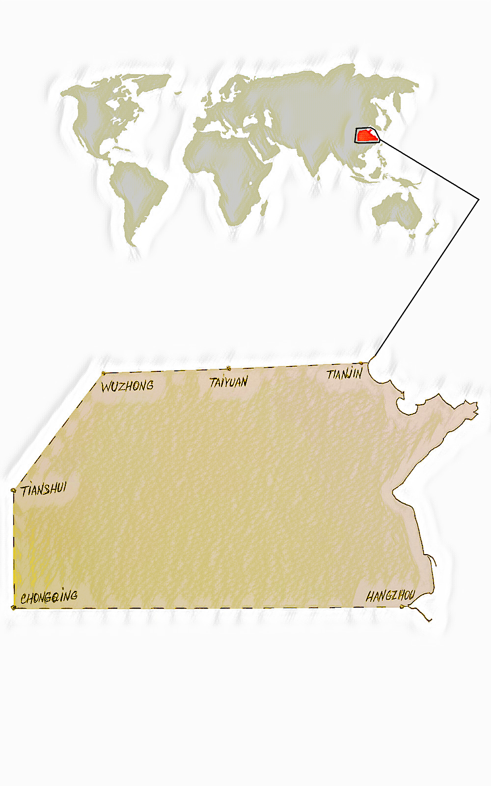 Tianjin (China), then to Shijiazhuang, Taiyuan, Wuzhong, south to Tianshui, Guangyuan, Chongqing, then from Chongqing east to Wuhan and Hangzhou.