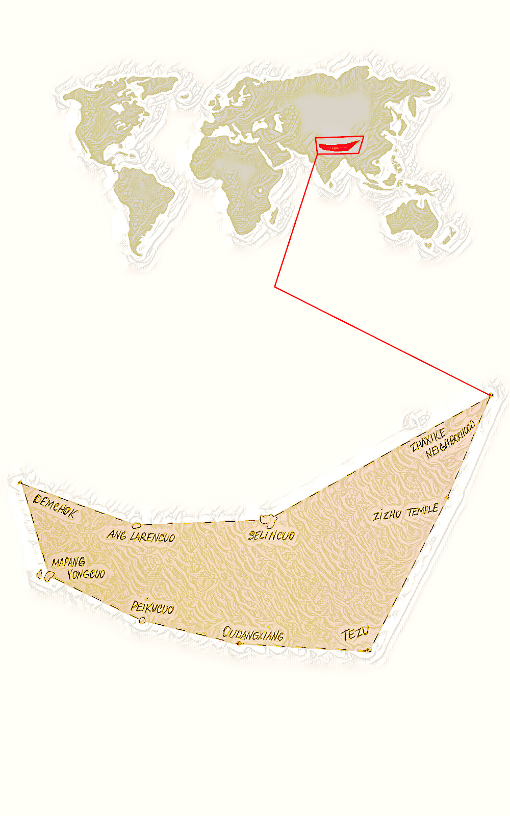 Demchok (India), from there southeast to Mapang Yongcuo Lake, further to Peikucuo Lake, Qudangxiang, Cuo Muzhelin Lake, Pu Moyongcuo Lake, Tezu, then to Zizhu Temple (Tibet Autonomous Prefecture), Zhaxike Neighborhood (Qinghai), Gama Town, Lake Selincuo, Ang Larencuo, Demchok.