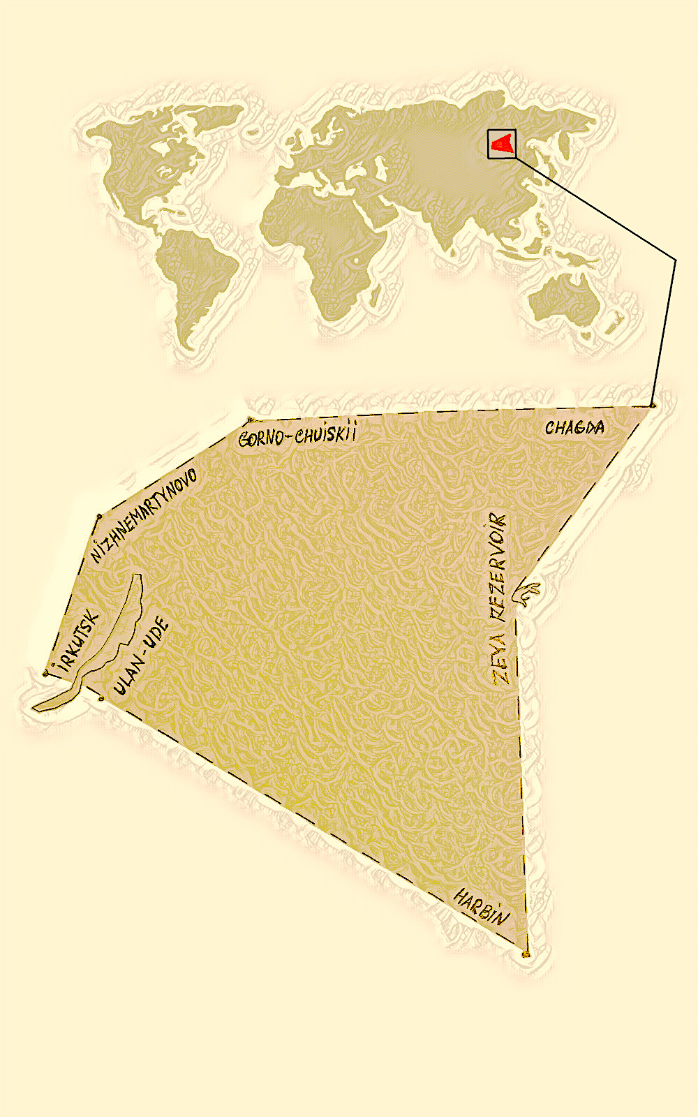 Khabarovsk Territory (Russia) and Yakutia – west from Chagda to Nizhny Kuranakh, from there west to Torgo, further to Perevoz, further west to Gorno-Chuiskii, Nizhnemartynovo, Karam, Irkutsk, from Irkutsk to Ulan-Ude, Chita, Nerchinsky Zavod to Harbin. From Harbin to Blagoveshchensk, from Blagoveshchensk to the Zeya reservoir, from the reservoir back to Chagda.