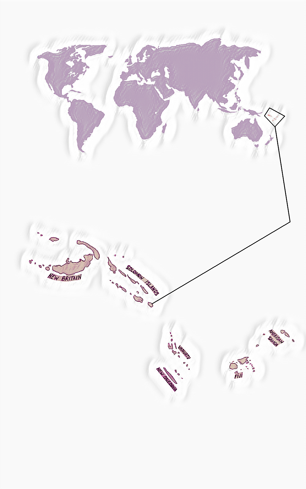 Solomon Islands, New Britain Island, New Ireland Island, Manus Island, Bougainville Island, Vanuatu, New Caledonia, Fiji, Wallis and Futuna, Tuvalu, Tokelau, American Samoa, Niue, Tonga, Nauru, Marshall Islands, Kiribati, Cook Islands, Federated States of Micronesia.