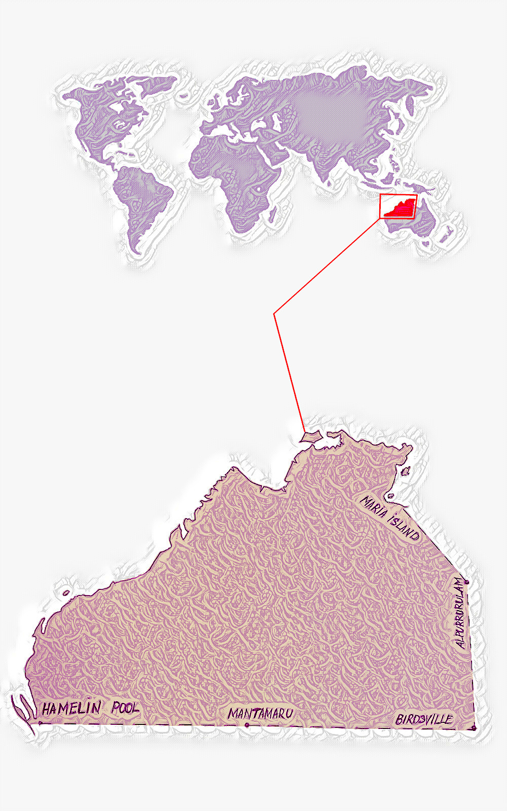 From Maria Island (Limmen, Australia) southeast to Alpurrurulam, thence south to Birdsville, from this city west to Finke, Mantamaru, Karalundi, Hamelin Pool. From here north along the coast to Maria Island (Limmen).