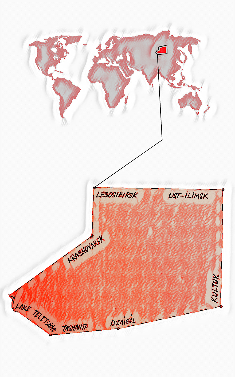 To the north from Kultuk (Irkutsk region, Russia) along Lake Baikal to Kirensk, Ust-Ilimsk and horizontally along the Angara River to the Yenisei River, more precisely to Lesosibirsk, and from there south to Krasnoyarsk, and to Abakan, from there south to Lake Teletskoye, and down to Tashanta, and from there east to Khandagaiti, Dzaigil (Mongolia), Ulaan-Uul (Mongolia), Khovsgol Lake National Park, Tunkinsky National Park, back to Kultuk (Irkutsk region).