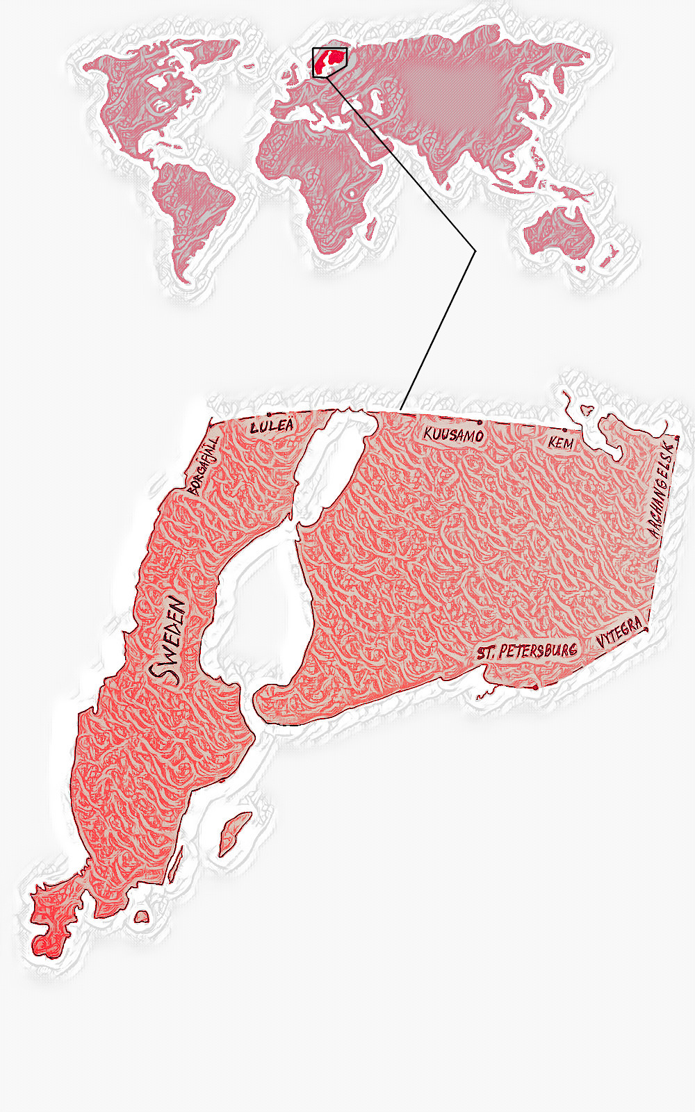From Arkhangelsk (Russia) to the west to the town of Kem (Karelia), from there to the west to the Finnish Kuusamo, from there to the west to Kuivaniemi, further to Tornio, Luleå (Sweden) and Borgafjäll (Sweden), further south along the Norwegian border to Zeeland (Denmark), from there east to Bornholm, Gotland, Helsinki (Finland), St. Petersburg (Russia), Vitegra, Arkhangelsk.