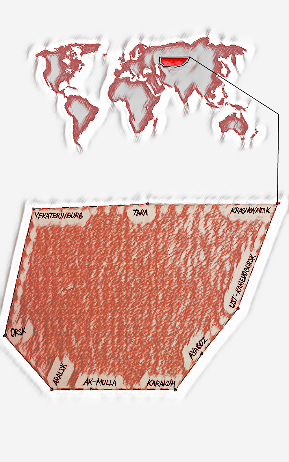 From Krasnoyarsk (Russia), west to Tomsk, and from there west to Tara (Omsk region, Russia), further to Tyumen and Yekaterinburg, further south to Orsk (Orenburg region, Russia), then south to Aralsk (Kazakhstan), then to Balkhash, Karakum, then north to Ayagoz (Kazakhstan), Oskemen, Lake Teletskoye, and from there to Abakan and Krasnoyarsk.