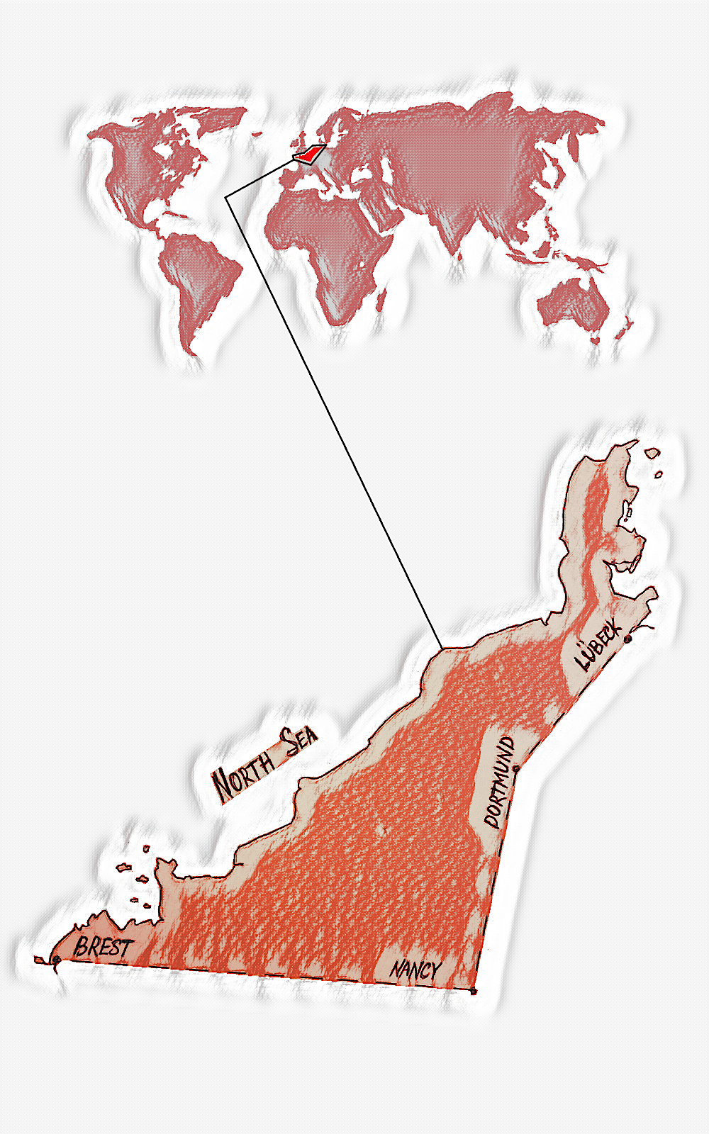 Denmark (except the island of Zeeland) to Lübeck, thence southwest to Hamburg (Germany), Dortmund, Luxembourg, Nancy, west to Paris, Rennes, Brest (France), thence north along the seafront back to Denmark, including the islands of Guernsey and Jersey.