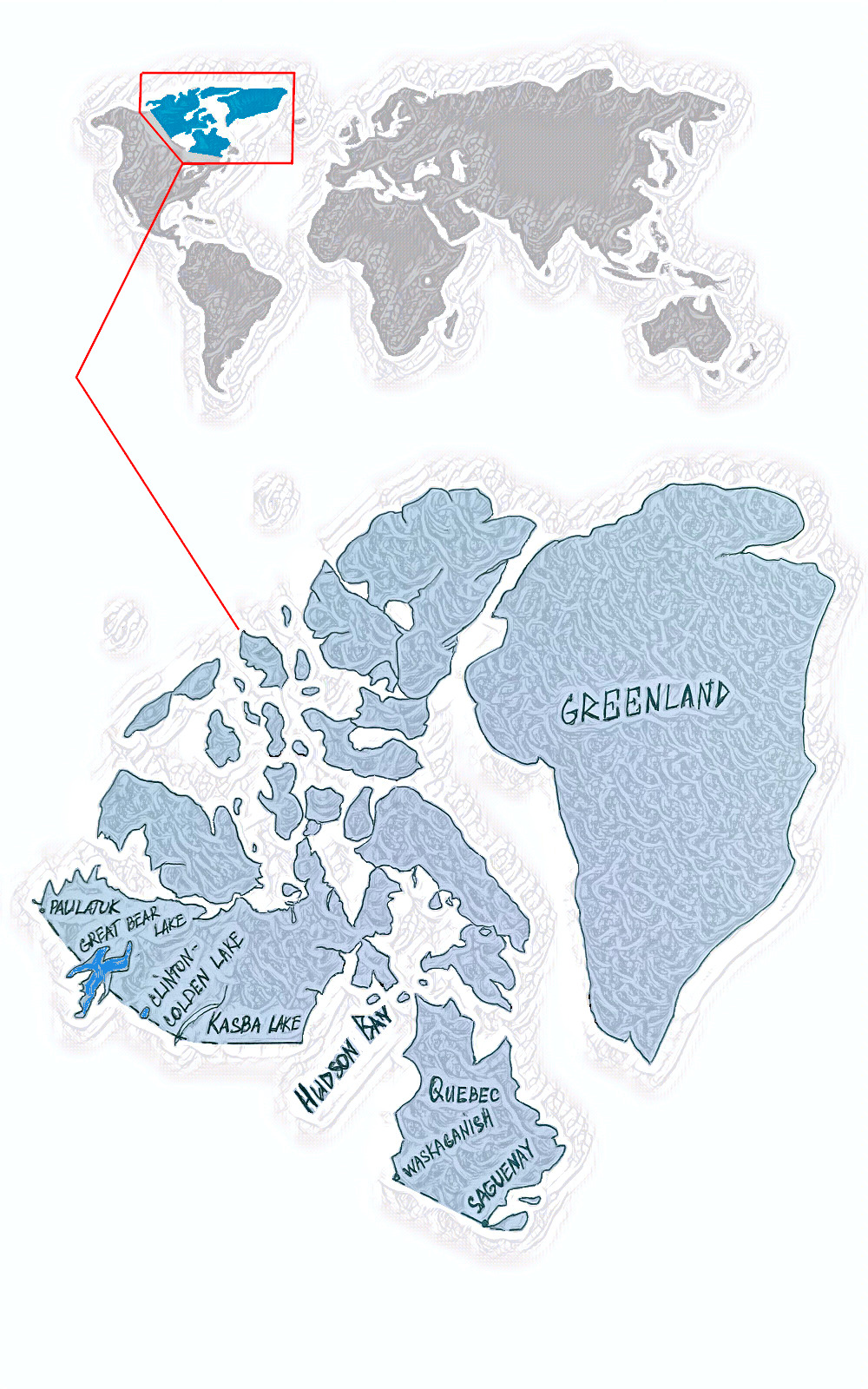Greenland. Nunavut. Northwest Territories (Canada) – a piece of land east of Paulatuk to the eastern shore of the Great Bear Lake (NWT) and further along the border of the canadian province to Clinton-Colden lake and further to Kasba lake, then to Waskaganish (Quebec), Saguenay.