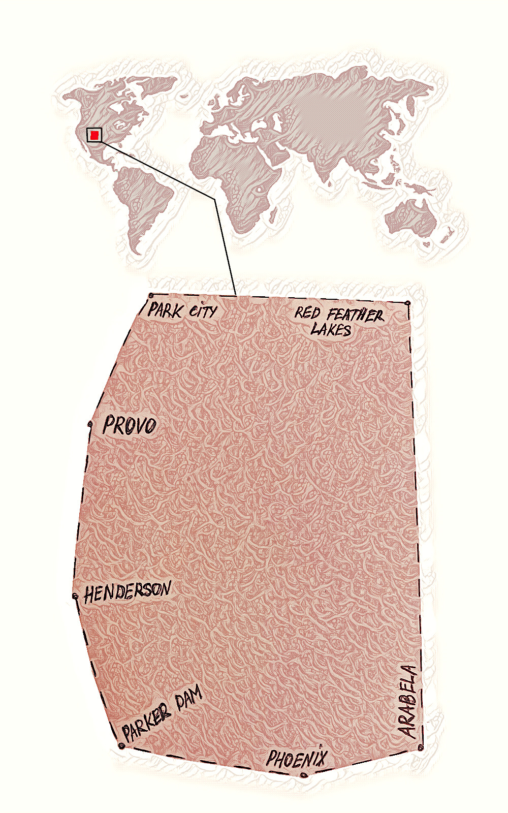 Parker Dam (California, USA), thence north to Henderson (Nevada), St. George (Utah), Provo (Utah), thence to Park City (Utah), then east to Lonetree (Wyoming), Browns Park National Wildlife Refuge, Red Feather Lakes, thence south to Denver (Colorado), Pueblo, Las Vegas (New Mexico), Arabela, further west to Pinetop-Lakeside (Arizona), Phoenix (Arizona), Parker Dam.