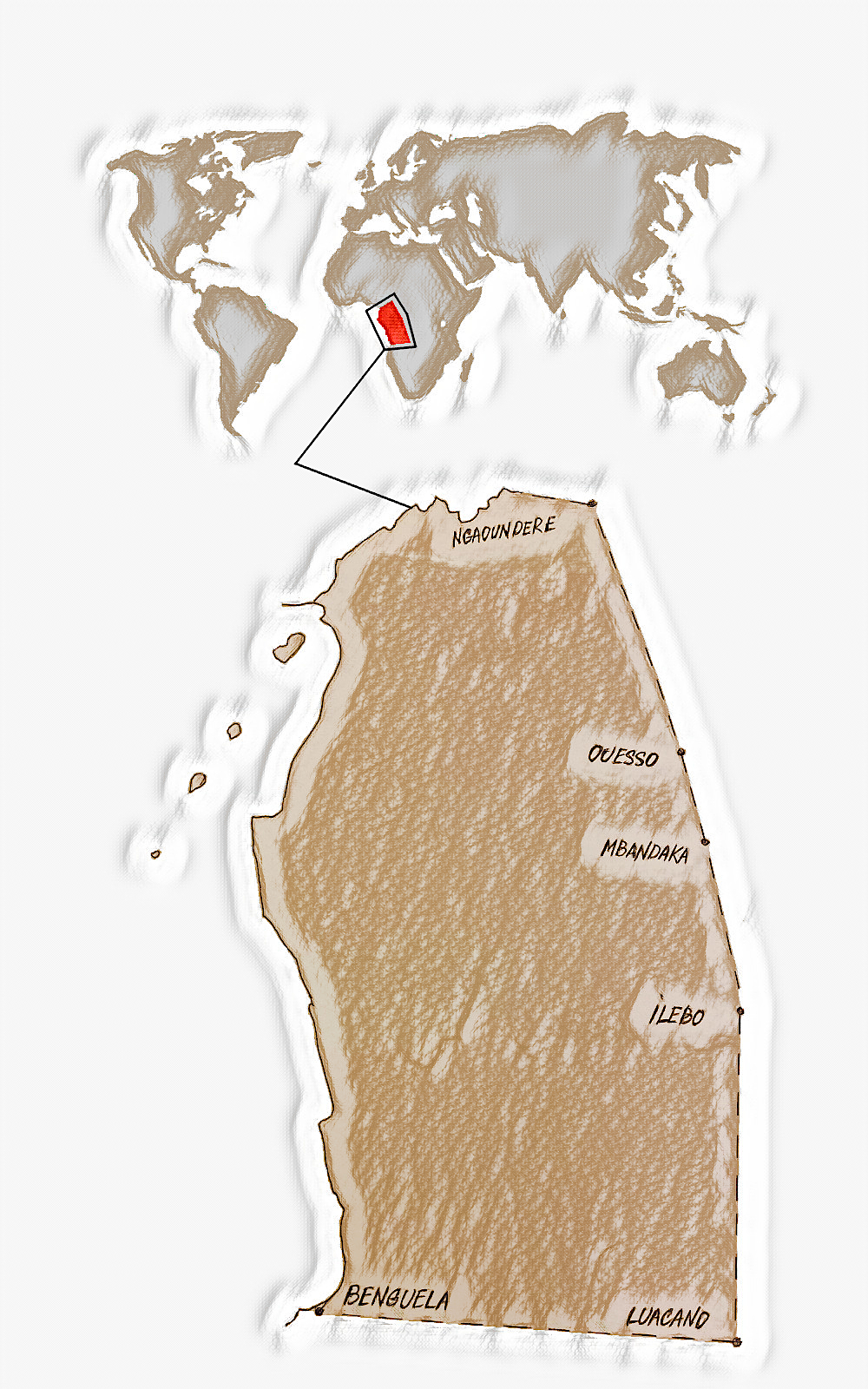 Sao Tome and Principe, Saint Helena Island, from Benguela (Angola) north along the coast to Ngaoundere, then south to Ouesso (Congo), Mbandaka, Ilebo, Luacano