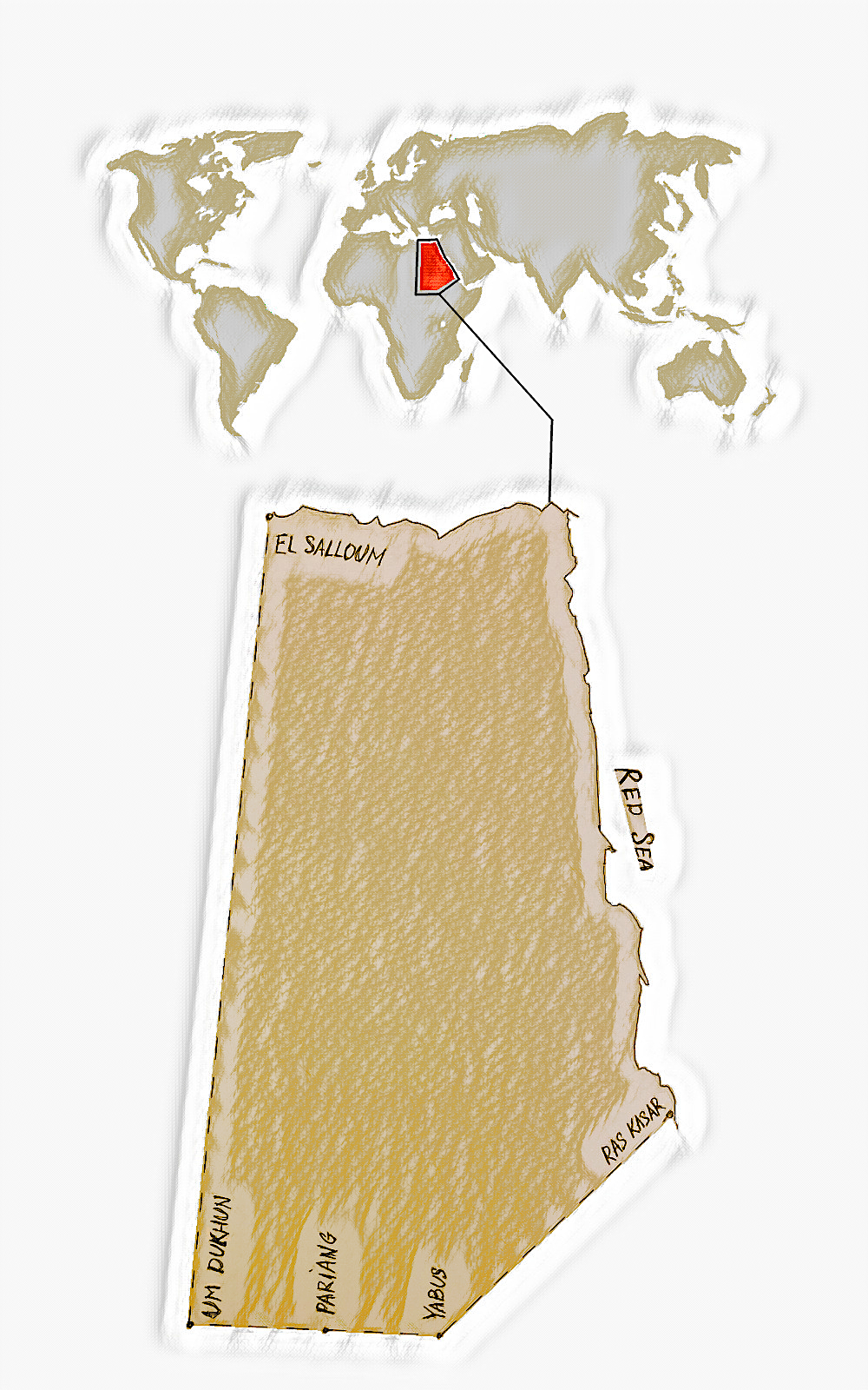 El Salloum (Egypt) east to Port Said, then south down the shore of the Red Sea to Ras Kasar (Eritrea), then to Yabus (Sudan), then west to Pariang (South Sudan), Um Dukhun (Sudan), thence north to El Salloum.