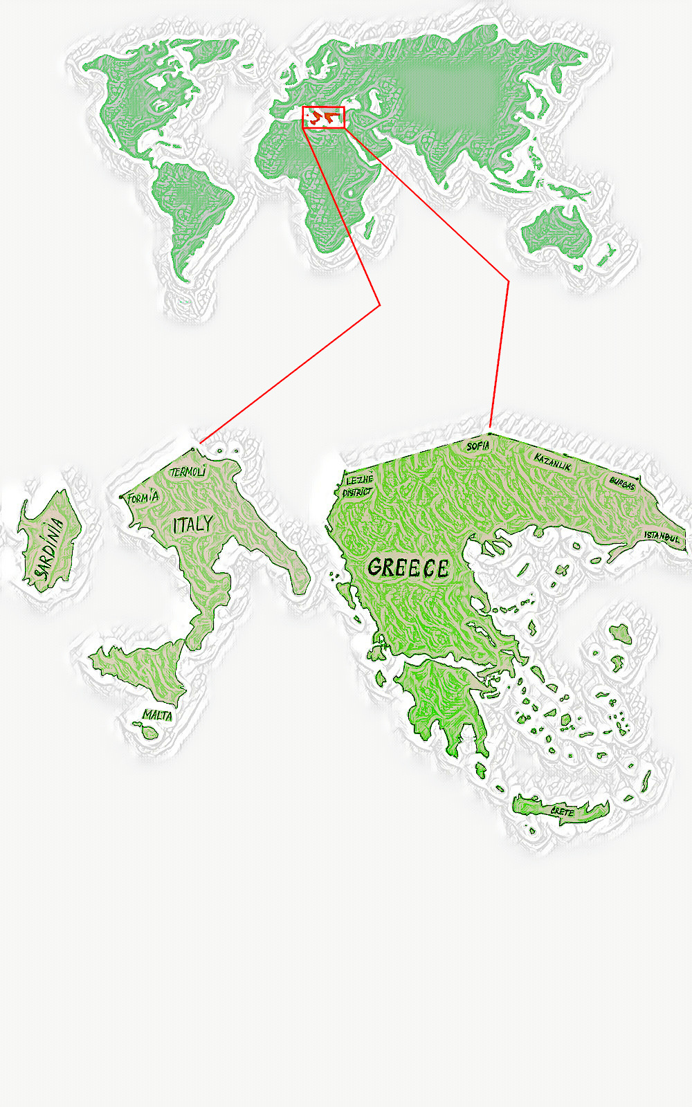 Lezhe (Albania), east to Sofia (Bulgaria), Kazanlik, Burgas, further to Istanbul (Turkey), from there along the promenade south to Seddülbahir, including the island of Gokceada, the island of Samothraki, the island of Lemnos, the island of Agios Efstratios, the island of Lesvos, island of Chios, island of Ikaria, island of Fournoi Korseon, island of Nera (nearby), island of Arki, island of Leros, island of Kalymnos, island of Levitha, island of Astypalea, island of Crete, from there northwest to Methoni (Greece), further west along the Ionian sea to the island of Malta, all of Sicily, Sardinia, thence east to Formia (Italy), further to Termoli, Tremiti island (Italy), thence back east to Lezhe.